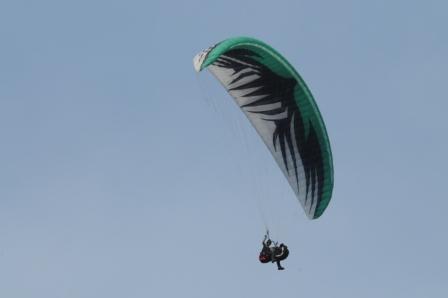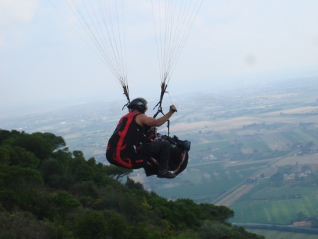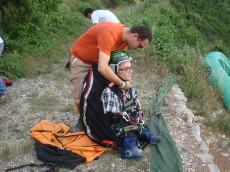ue ragazzi partiti con le rispettive vele per andare a saggiare l'aerologia sono passati col pollice alzato sul decollo indicandoci che la giornata era ottimale per quello che dovevamo fare, poi sono andati subito nell'atterraggio sottostante per farsi poi trovare nel punto preciso dove avrei toccato il suolo e darmi cosi' una mano a garantire un contatto ultra soft per l'amico Sebastian.